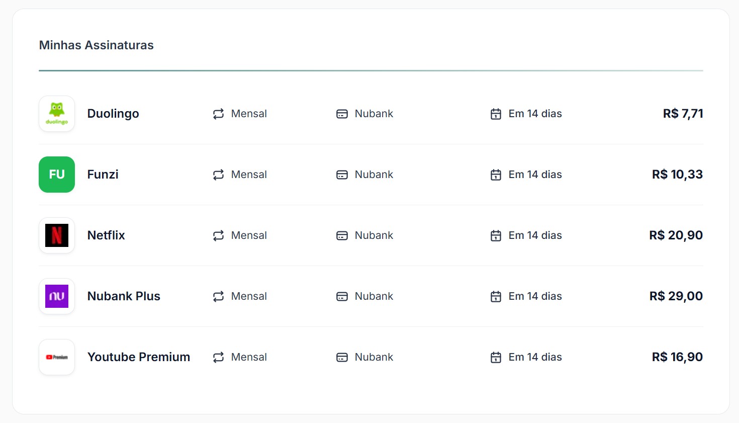 Centralize todas as suas assinaturas recorrentes em um painel simples e intuitivo. Acompanhe valores, datas de renovação e mantenha o controle total do seu orçamento.
